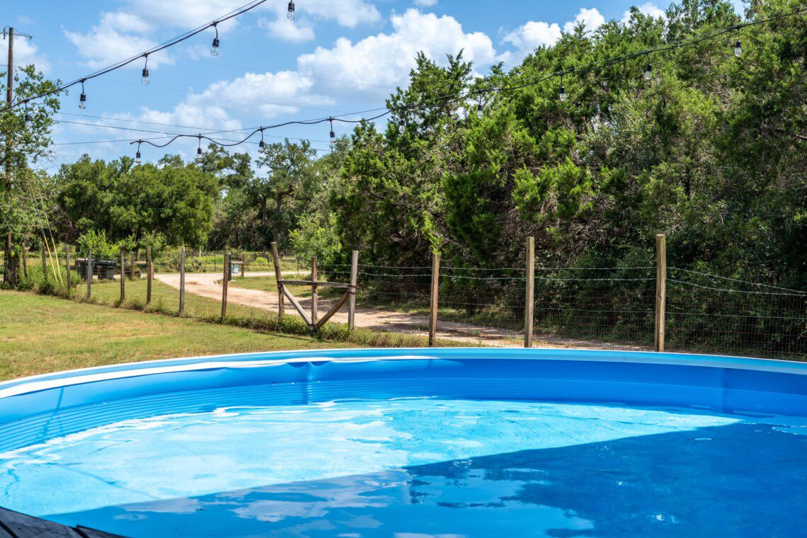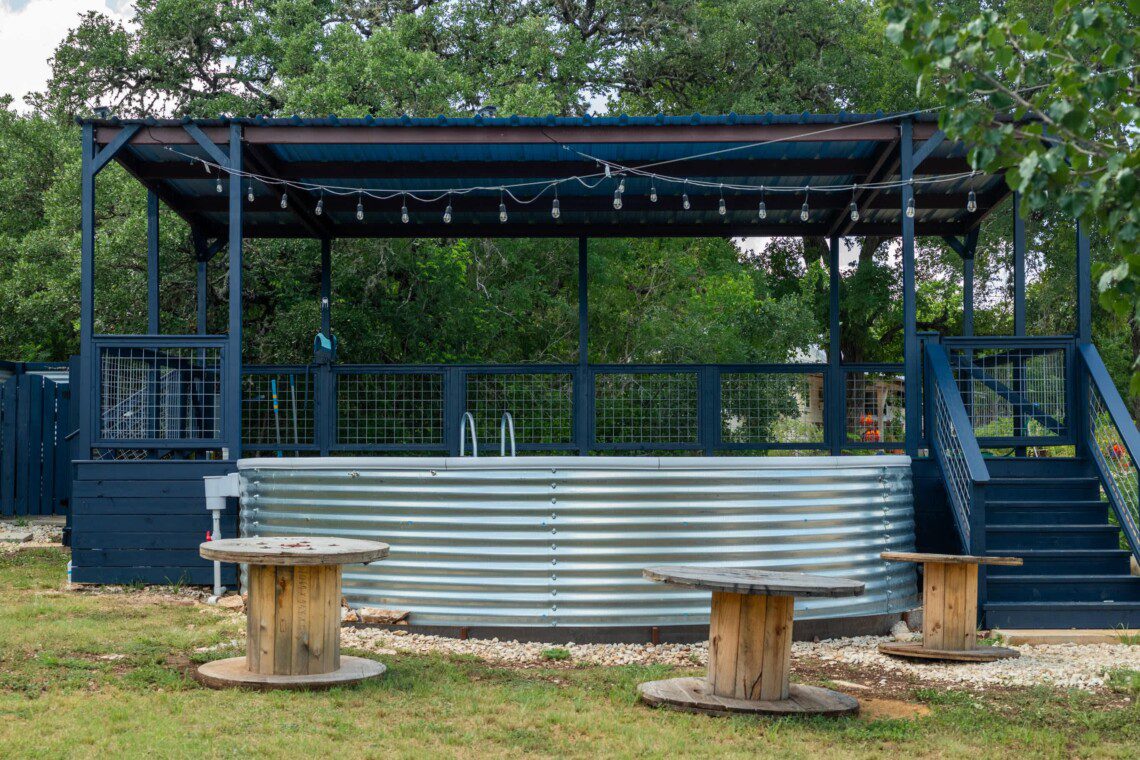 ✔ 🏊♂️ Cool off in our 18′ round, 4′ deep communal tin trough pool — exclusively for Rustic Barnyard guests, featuring a shaded pool patio and relaxing deck for laid-back Hill Country hangouts!