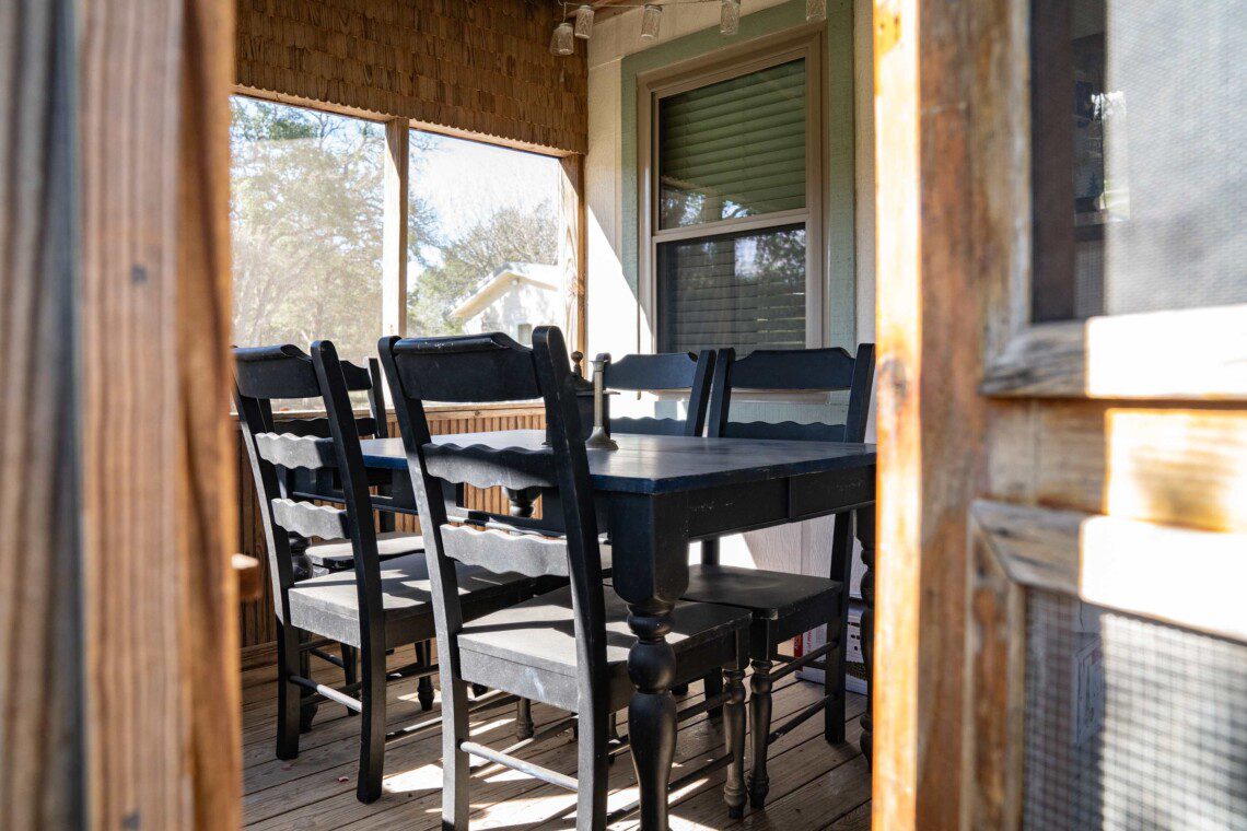 🔹 Screened-in front porch – Rocking chairs, patio table, and scenic views